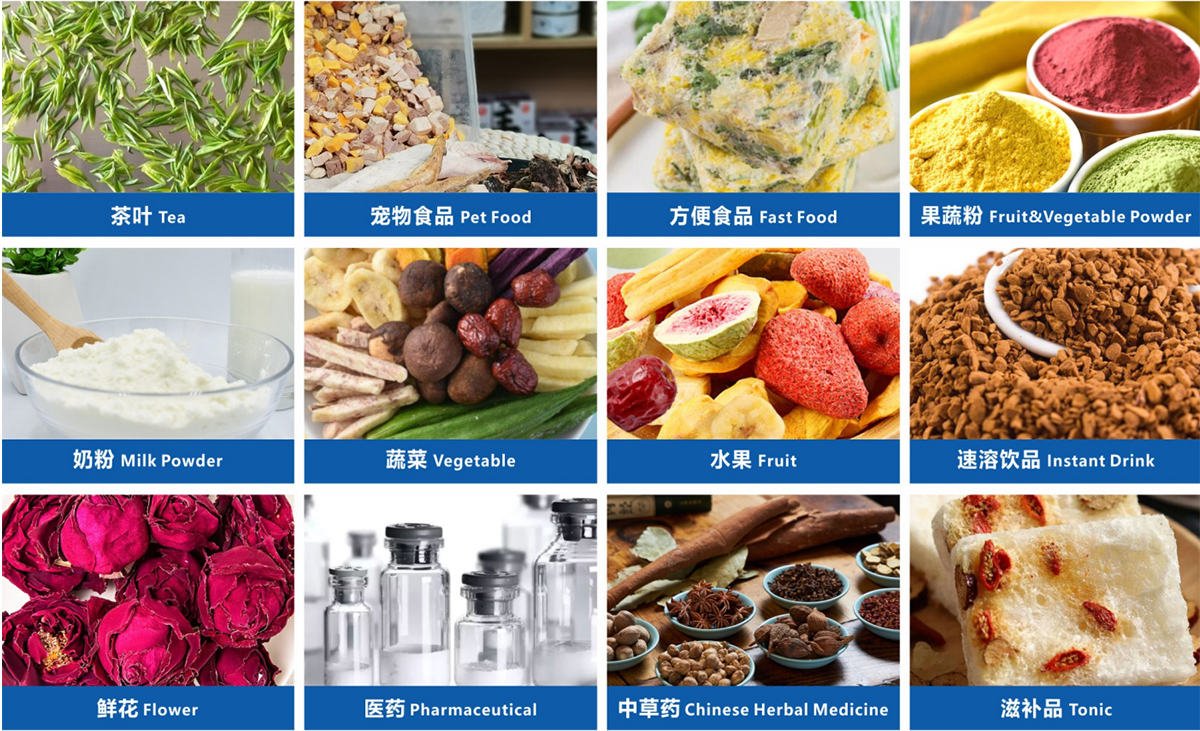 凍干機適用于食品、蔬菜、水果、植物提取物、中藥材、鹿茸、果粉、花卉、咖啡、海參、生物制品和化工物料等產品